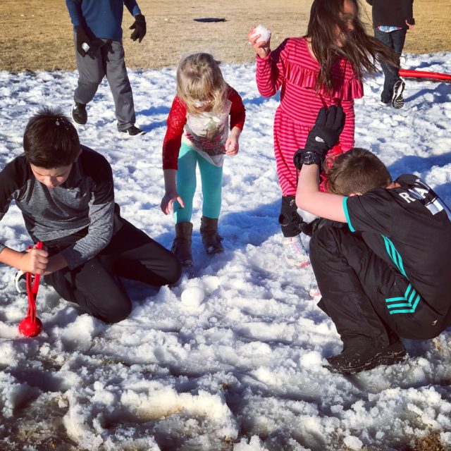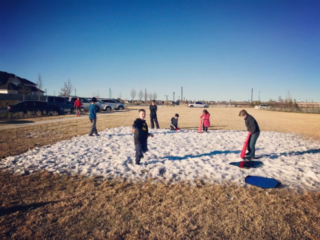 As soon as we rounded the corner, anticipating the blizzard, the sounds of disappointment were audible. In the middle of the giant field at the neighborhood center, the patch of snow looked quite tiny. There were no snow machines spewing snow. In fact, when we arrived, there were only a few little tiny kiddos playing in the snow. None of the boy’s friends had arrived yet. And there were certainly no snowball fights going down.